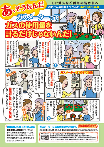 なかなか嫁の存在を認めてないお姑さんが、ガスメーターの復帰操作をいとも簡単に済ませてしまう嫁の姿に、感心し仲良くなるという場面をマンガで見せる「復帰方法」の周知チラシ。いまでにない面白いストーリーに、これなら読んでくれると好評をいただいています。