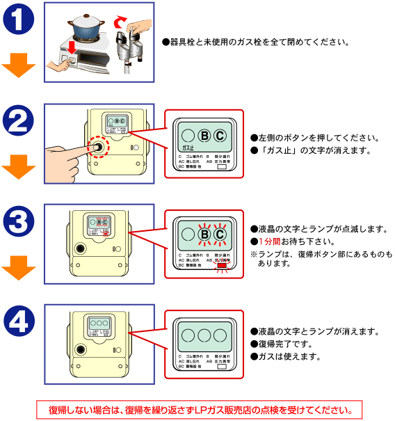 マイコンメーターの表示部に「ガス止」と文字が表れ、ガスが止まったときは、復帰の手順に従って操作してください。ガス漏れなどの異常がない場合は、復帰してガスが使えるようになります。